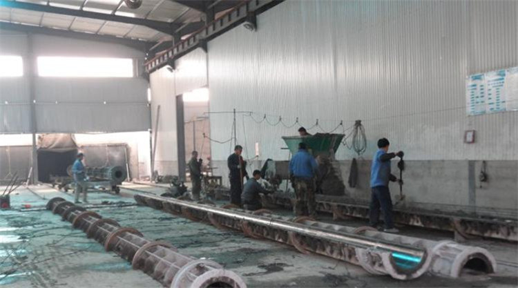 生產水泥電線桿是在一定轉速(產生足夠的離心力,使水泥料形成中間空的電線桿)的鋼模中用蒸汽養護而成。鋼模是兩個半模合成的,以便加料與取出成品。因此在成形之前需要對電線桿鋼筋骨架(鋼筋籠)的制作與符合比例要求的水泥料漿(水泥+石子+砂+水)的混合攪拌,因此其生產制作原理是簡單的,但需要一定的吊運設備、場地及一定的機械設備。