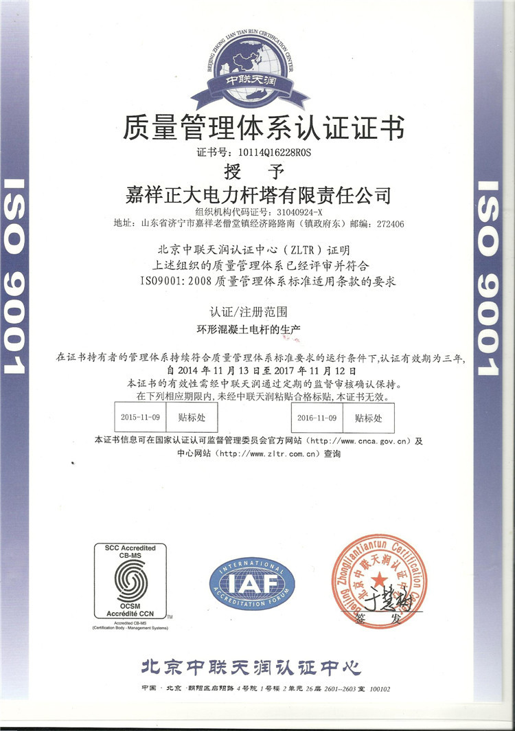 嘉祥正大電力桿塔有限責任公司是生產各種環形水泥混凝土電桿、水泥三盤。公司成立于2006年,地處是孔孟之鄉—山東濟寧,環境優美,交通便利,現擁有資產3500萬元(其中固定資產2000萬元),占地40000平方米(其中建筑面積8000平方米),現有職工185人,其中技術人員19人,大中專以上學歷15人。自零六年成立以來,以雄厚的實力、精良的設備、先進的技術、優質的產品在短短幾年的時間內,躍居山東省水泥制品行業的先進行列。先后被濟寧市政府命名為“重合同守信用單位”、“文明單位標兵”;被濟寧市勞動局評為“安全規范化單位”;連續三年被濟寧市質量技術監督局授予“產品質量信得過單位”,阿里巴巴誠信通第三方認證企業,是干凈純潔的水泥電桿網絡銷售平臺!