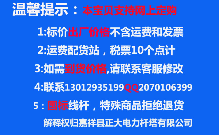 親,線桿標價格為出廠價格,不含稅票和運輸費用,要的量大量少運輸費用都一樣,請慎拍,運輸車從配貨站調用,費用由配貨站決定,公司不賺運費,拍前務必聯系客服QQ2070106399或致電經理13639410600修改寶貝價格。